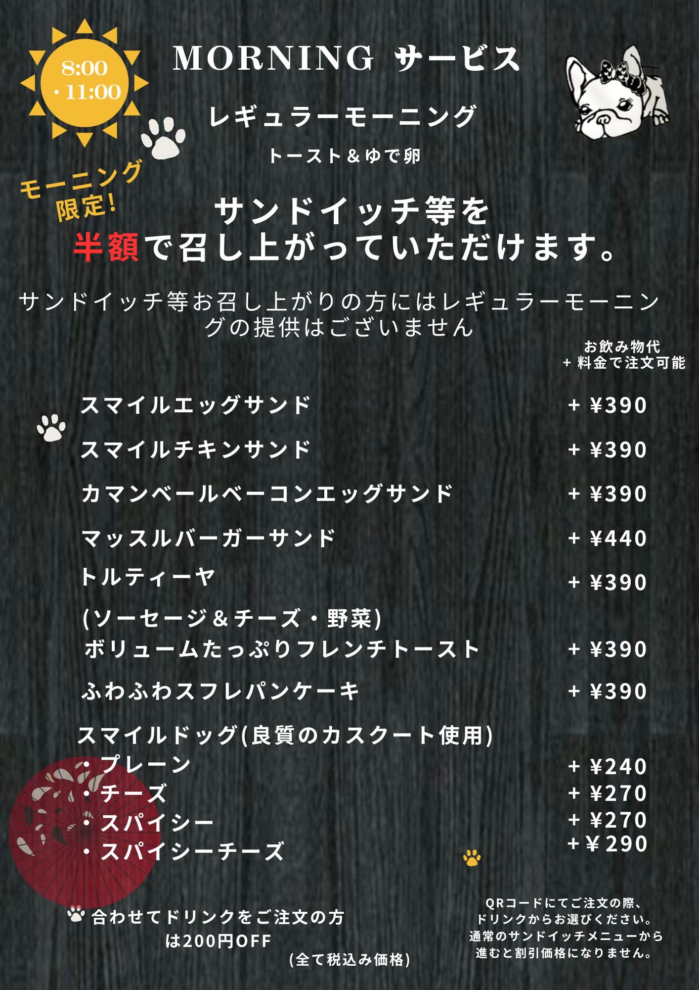 こちらのページでは、当店Wonder Smileのメニューをご紹介させていただきます。モーニング・カフェ・ランチ・ディナー・バーと様々な場としてお楽しみいただける当店ならではの幅広い豊富なメニュー!時間や目的によって違う顔を見せる当店を、是非深くまでお楽しみください。リーズナブルな価格で体も舌も喜ぶものを!※表示価格はすべて税込みで表示しております。